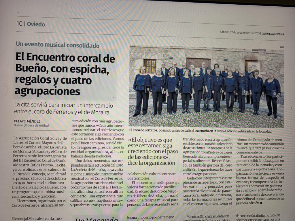 Encuentro coral en Bueño, el 11 de Octubre a las 19:00h. Publicacion en LNE septiembre 27, 2025 coroferreros Comparte esto: Compartir en X (Se abre en una ventana nueva) X Compartir en Facebook (Se abre en una ventana nueva) Facebook Me gusta Cargando... Relacionado Publicado por coroferreros Asociación Musical Coro Ferreros Ver todas las entradas de coroferreros