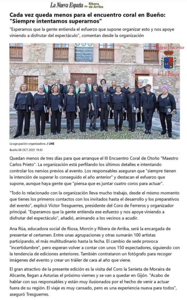 Publicación en LNE del encuentro coral en Bueño. octubre 9, 2025 coroferreros Comparte esto: Compartir en X (Se abre en una ventana nueva) X Compartir en Facebook (Se abre en una ventana nueva) Facebook Me gusta Cargando... Relacionado Publicado por coroferreros Asociación Musical Coro Ferreros Ver todas las entradas de coroferreros